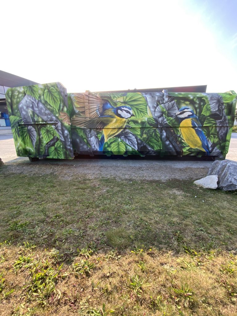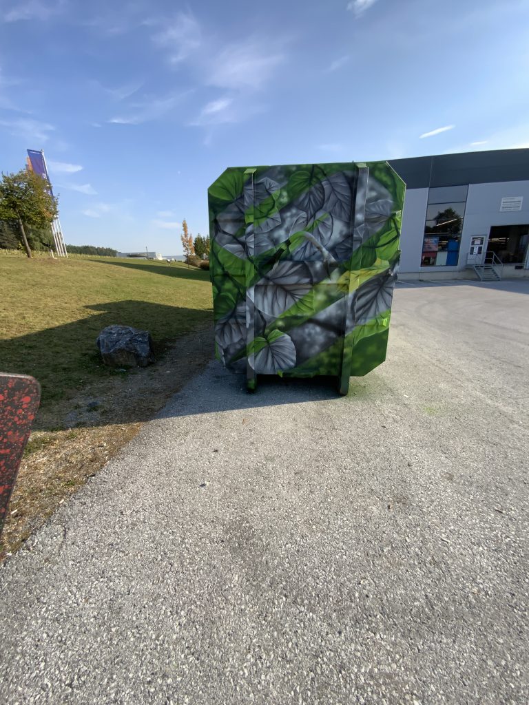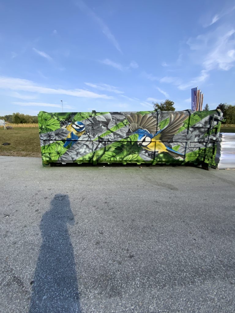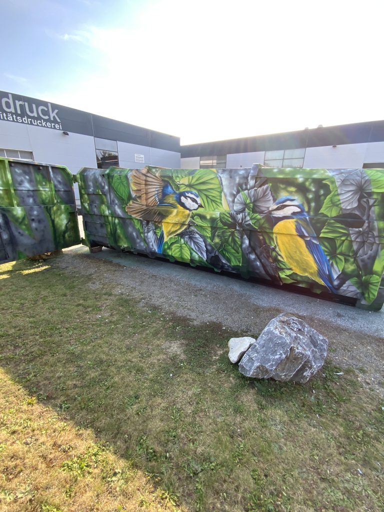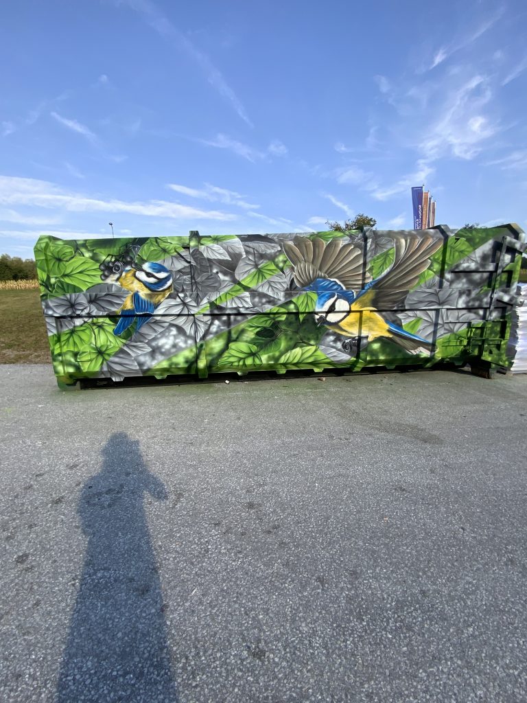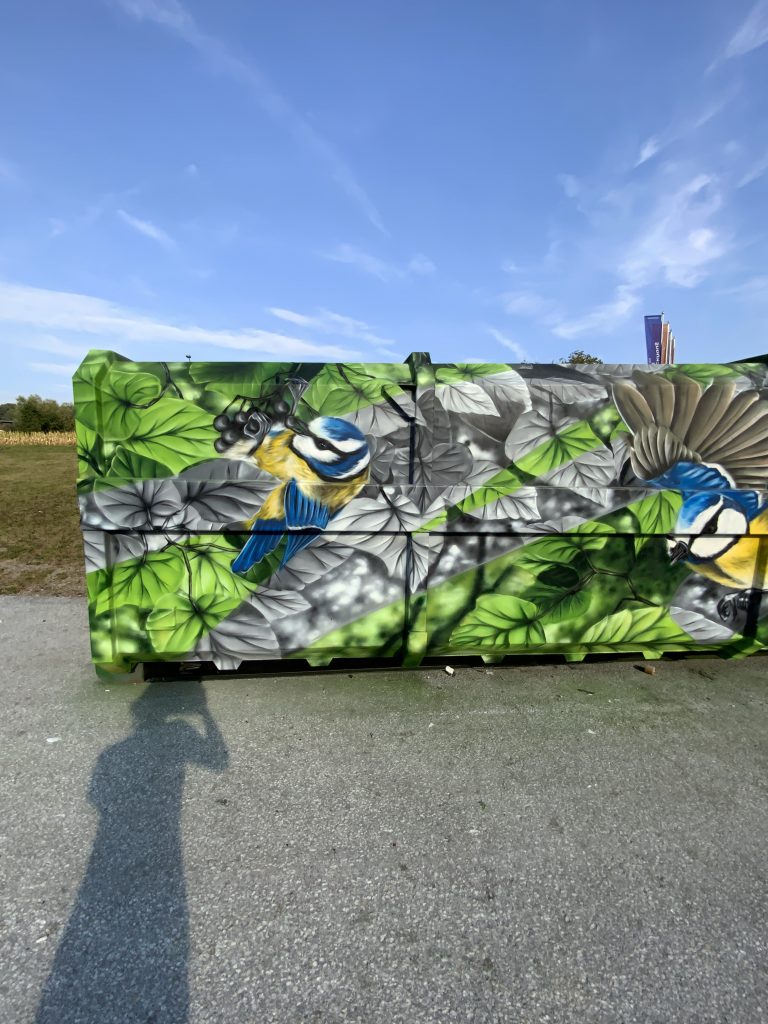 Der Kunde hatte den Wunsch das sich der Container besser in die Landschaft einbettet. Aus diesem Grund habe ich mich für ein Design mit Blaumaisen und Lindenblättern entschieden.