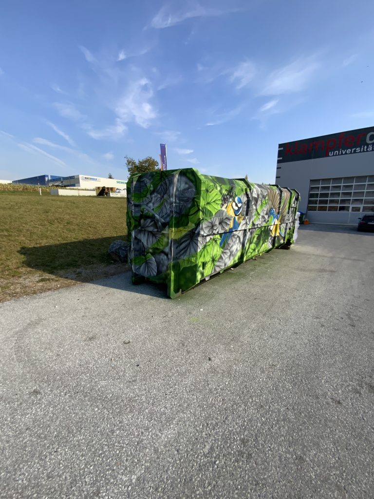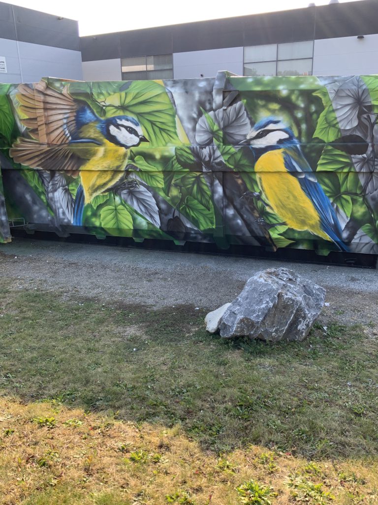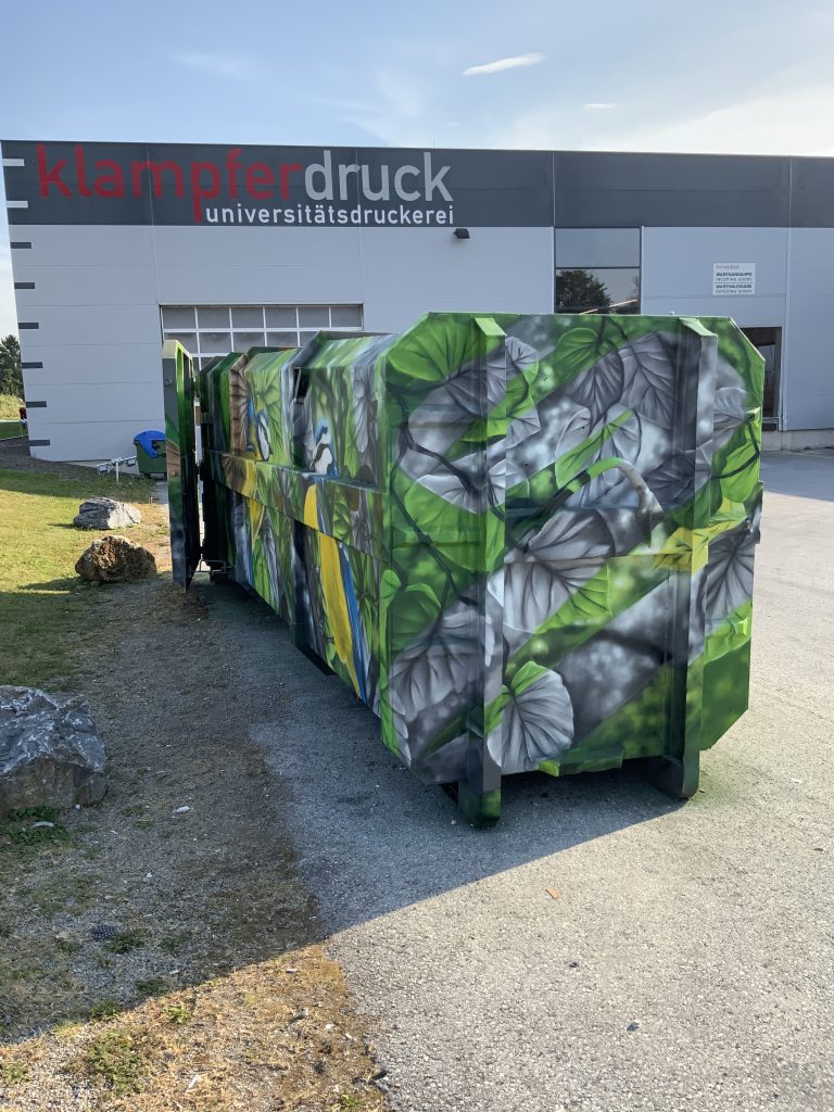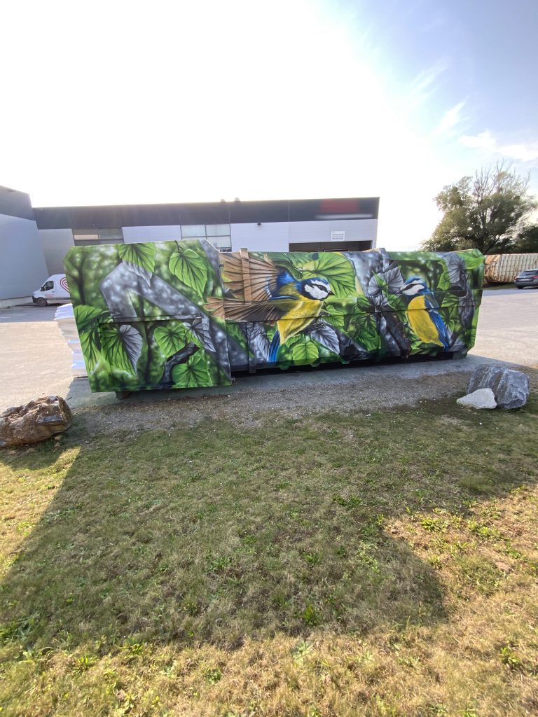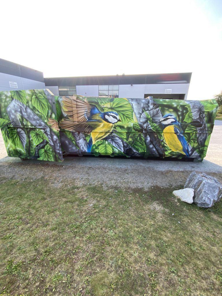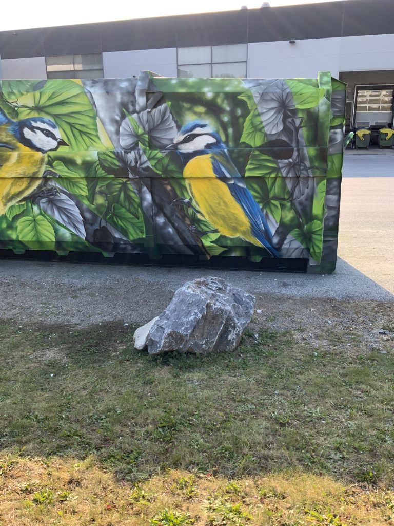Der Kunde hatte den Wunsch das sich der Container besser in die Landschaft einbettet. Aus diesem Grund habe ich mich für ein Design mit Blaumaisen und Lindenblättern entschieden.